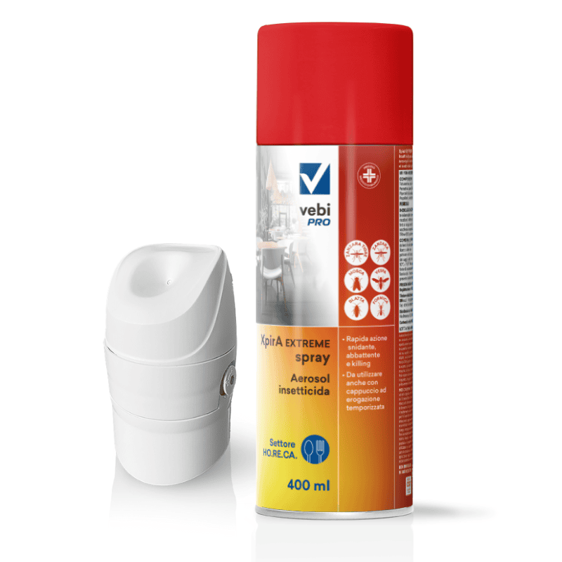 Le bombole automatizzate Vebi PRO garantiscono un rilascio controllato di insetticida negli ambienti professionali, per un’azione efficace, sicura e costante.
